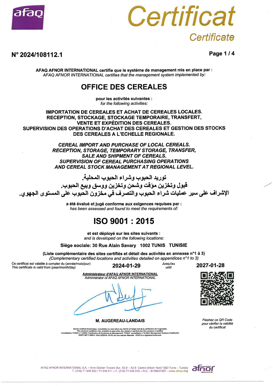 L’Office des Céréales a obtenu la certification ISO 9001 :2015, valable pour la période du 29 janvier 2024 au 28 janvier 2027 et délivrée par l’organisme de certification AFAQ AFNOR INTERNATIONAL.